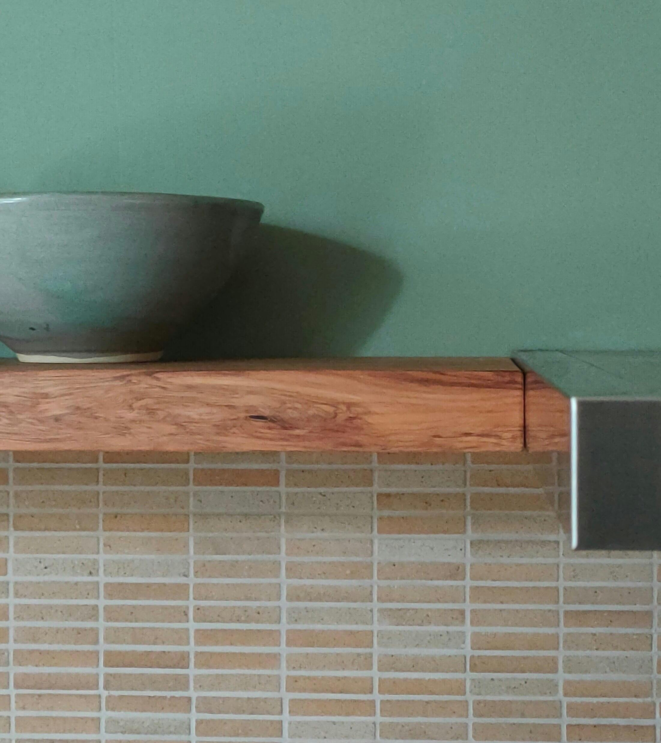 Shelves with a depth of more than 210mm may be manufactured using two pieces of timber glued lengthwise. We try to match the appearance of the two pieces but as this is a natural product there can be visual variations, which in our opinion makes it more beautiful. Grain profile between the two sections is also rotated 180 degrees to eliminate warping.
