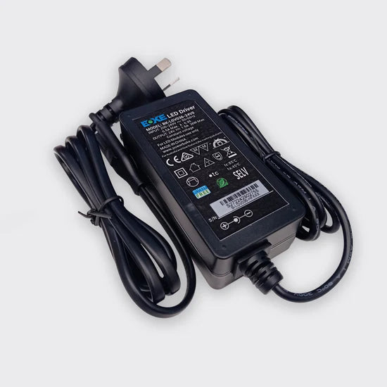 These 24V power supplies work with linear LED ribbon strip or other constant voltage luminaires, suitable for indoor use only, with a DC connection and 3-pin wall plug for quick connection. IP20 rated.